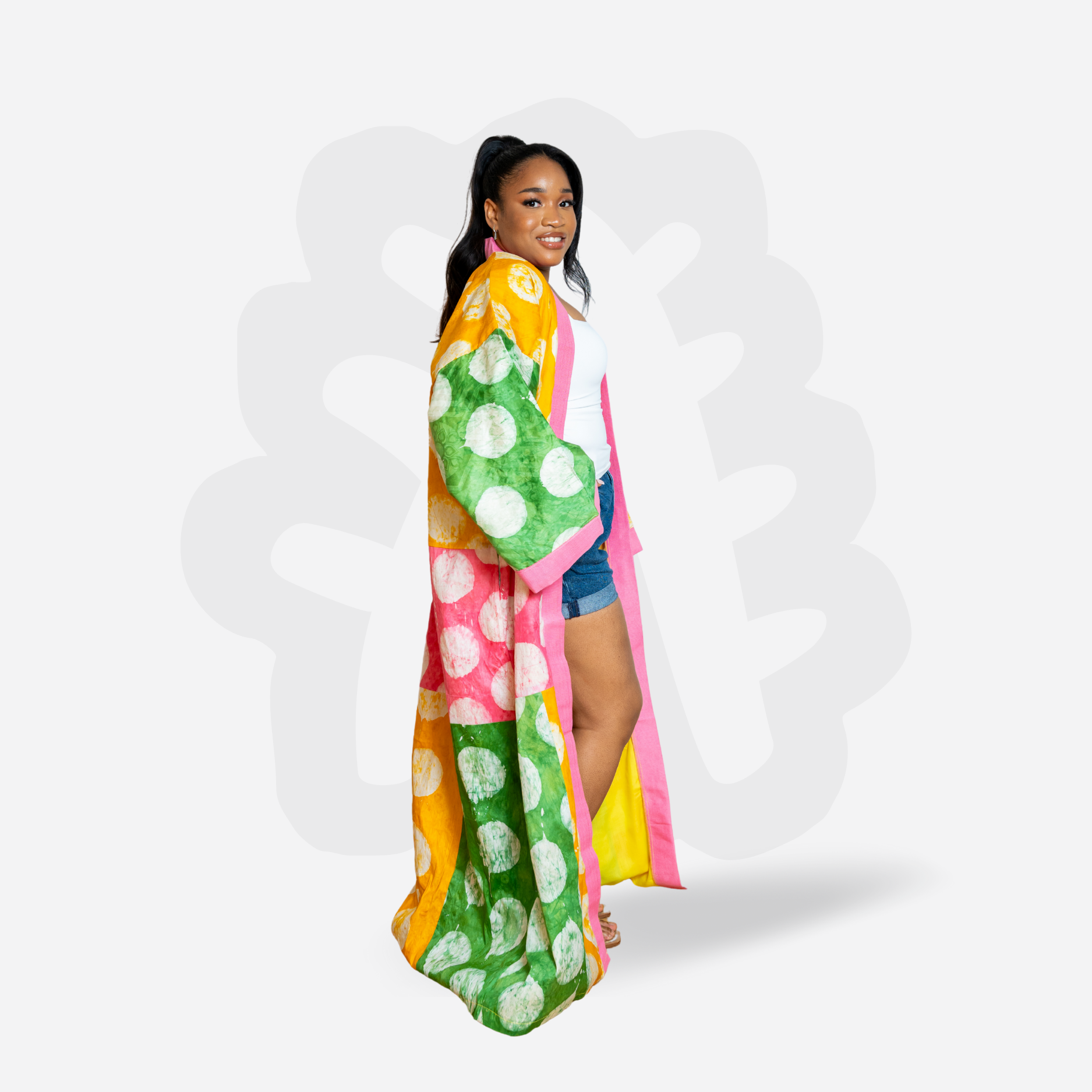 Turn heads and spark joy in every step with our vibrant Patchwork Kimono — a playful fusion of color and fearless self-expression. Crafted from hand-dyed panels in bold hues of green, pink, orange, yellow, this lightweight kimono wraps you in comfort and confidence.