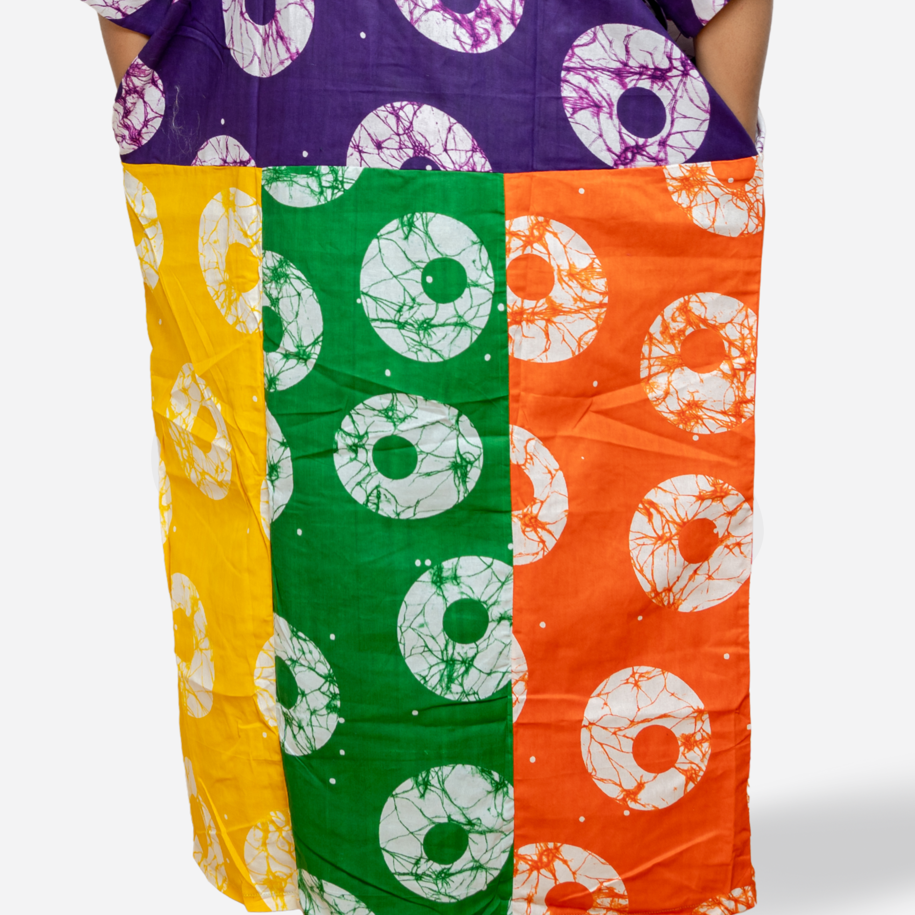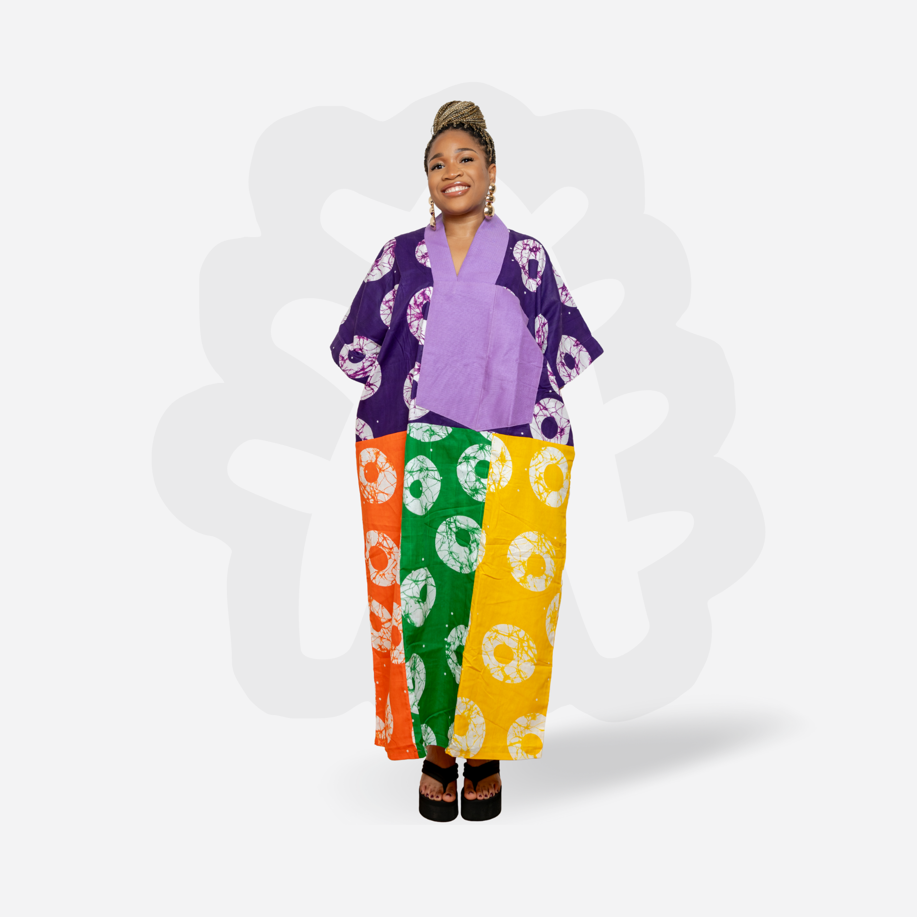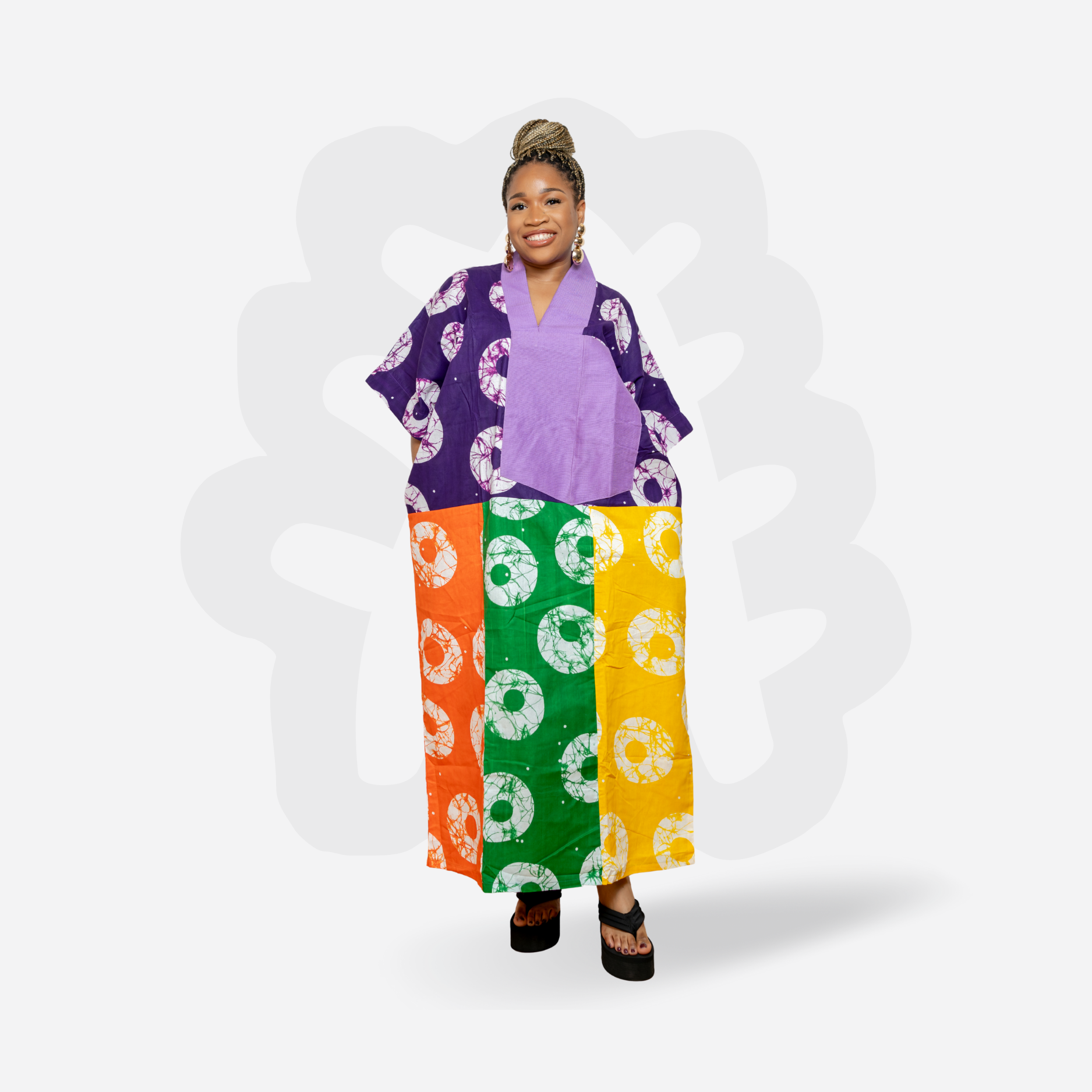 This Collage Bubu is crafted from 100% cotton and hand-dyed using Ankara Fabric. Each panel features a different vibrant pattern, carefully assembled into a harmonious patchwork design — no two are the same. The neckline is elevated with a bold hand-woven Aso Oke insert, adding a premium Nigerian textile heritage touch. Designed in a free-size, oversized silhouette for graceful draping and comfort.