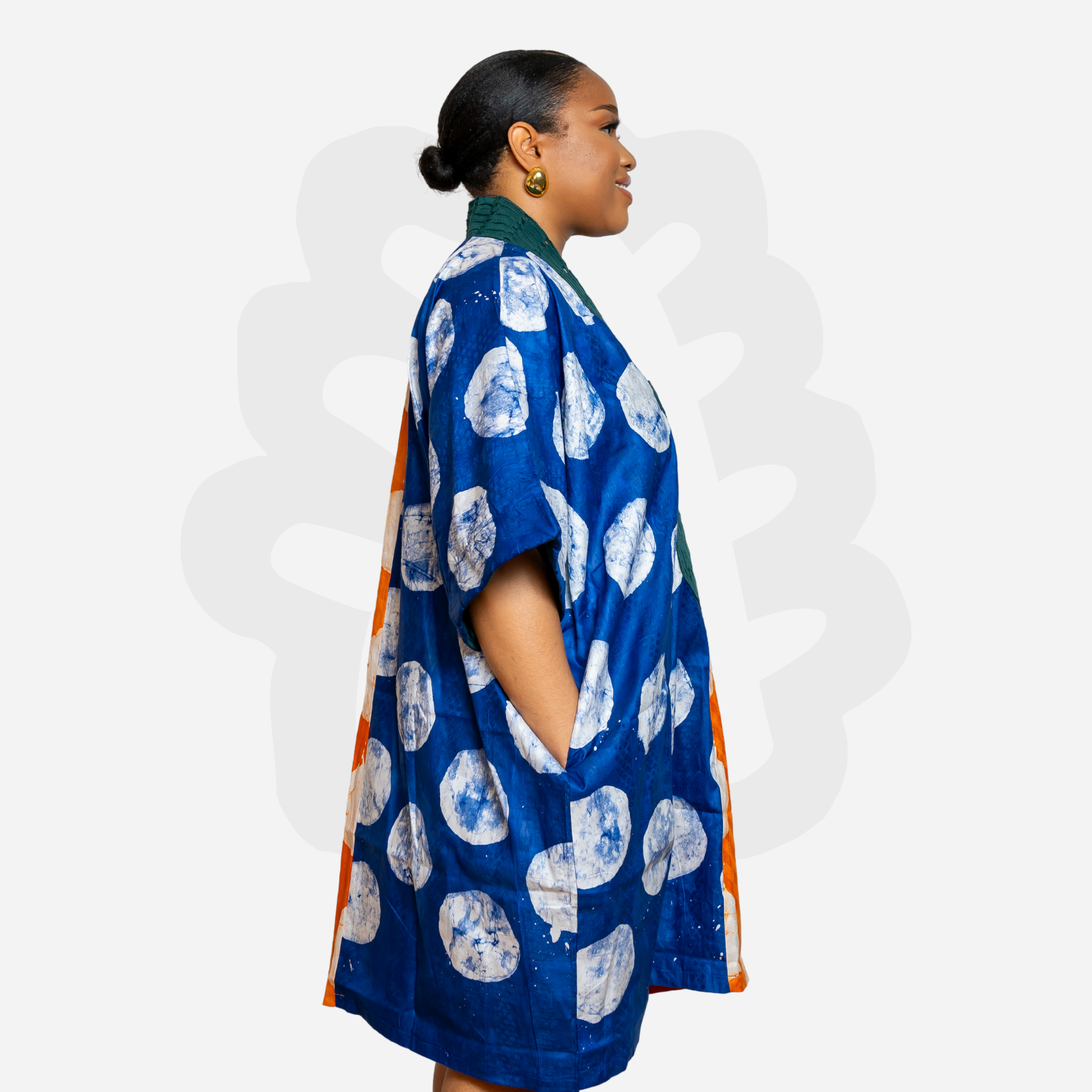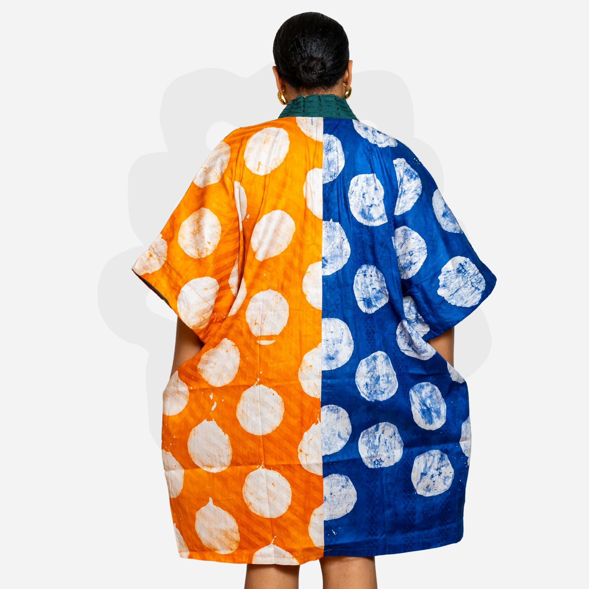 Turn heads with this vibrant Shorty Bubu. Designed to be both expressive and playful, this piece blends contemporary edge with deep-rooted Adire tradition. The hand-dyed batik center panel adds contrast and structure, giving this mini-length kaftan a standout silhouette.